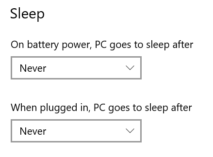 - For Windows 10: Under Sleep, set the drop-down options to Never for both On battery power and When plugged in.