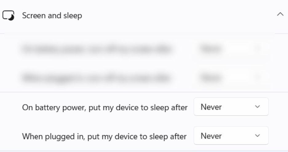 - For Windows 11: Under Screen and Sleep, set On battery power, put my device to sleep after, and When plugged in, put my device to sleep after to Never.