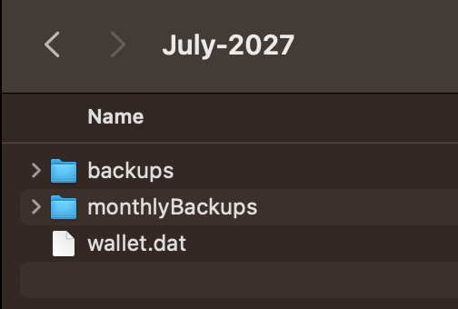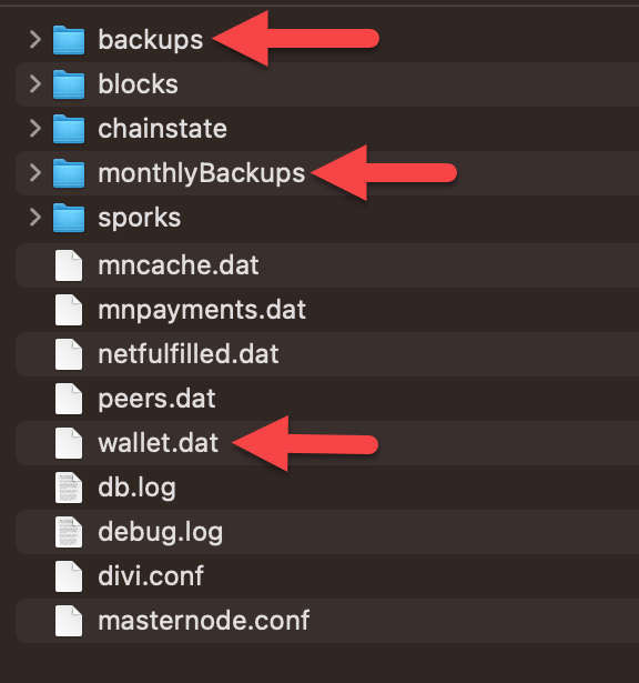 wallet.dat(this holds your actual wallet data)backups(folder of auto-generated backups)monthlyBackups(longer-term backups)